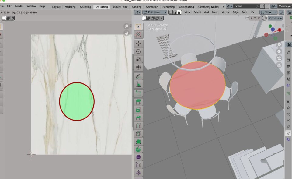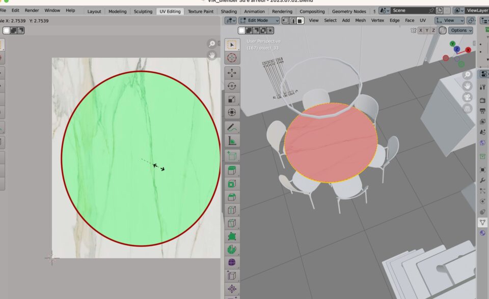 - In the right window, you will see your texture, in a flat way, and the shape of your object. By scaling, moving, rotating that shape, you will make transformations to the texture of the object!