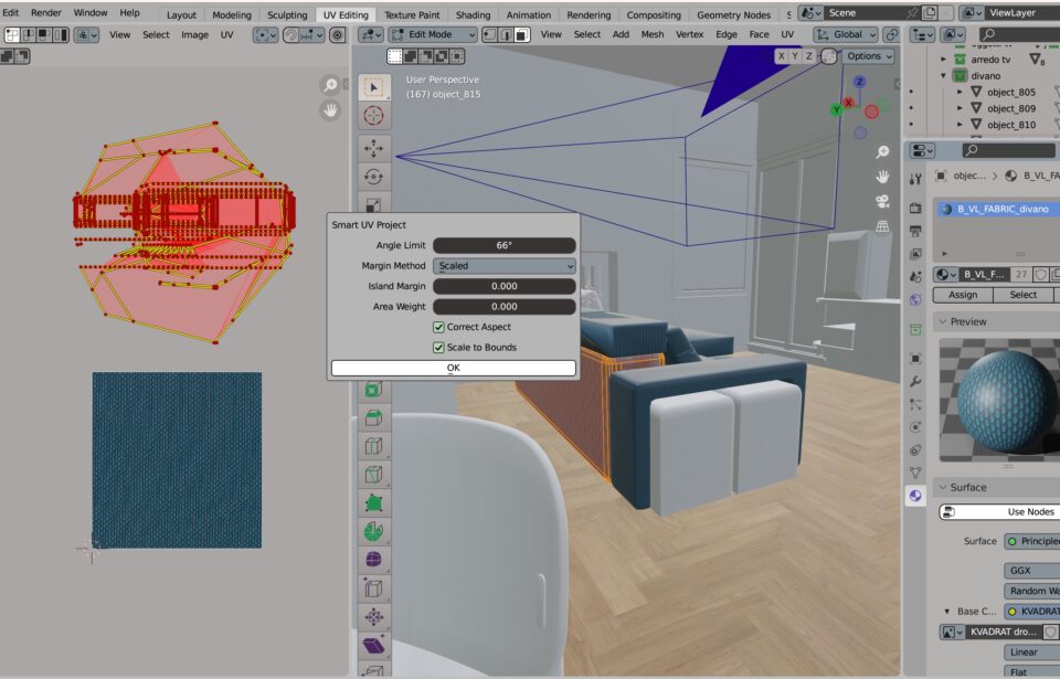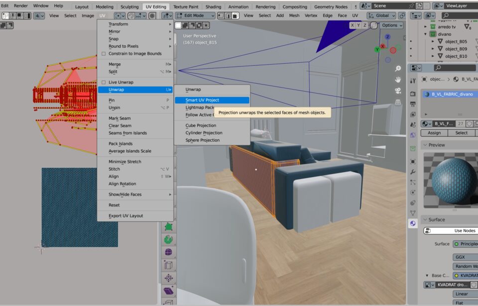 - go into UV options in the left window with the texture, then Unwrap and then click on SMART UV PROJECT