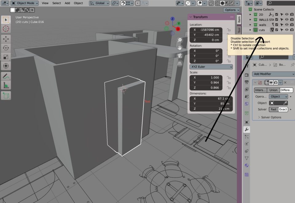 7. … you can place the volume of the cut in a hidden layer. Why? Because thanks to the modifier you can move easily in the future the hole by moving this volume!! Very useful!