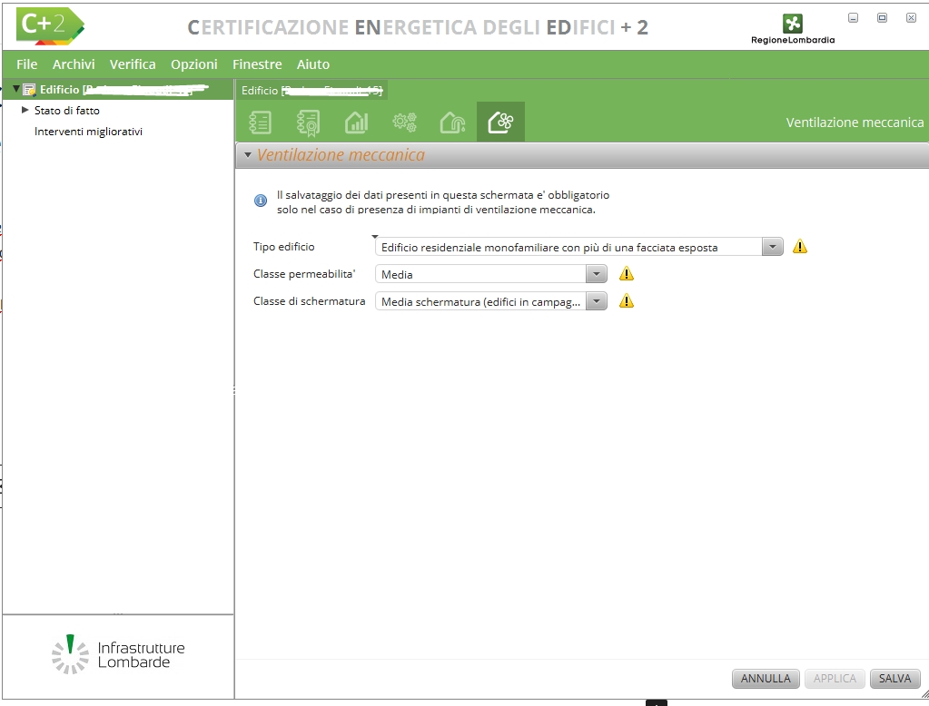 Compilare la scheda del fabbricato (prima di entrare nel merito del SUB), la scheda del tecnico – cioè se stessi, e di tutte le prime generalità sulla località, catasto e così via. Il modulo di riferimento principale è il MODULO C. Vi saranno delle prime voci non chiarissime, tipoo: il modo in cui valutare la classe di permeabilità dell’edificio nella scheda Ventilazione Meccanica,. Alta, media o bassa? Come da consiglio d’oro n.2 , la risposta è semplicissima e si trova nel modulo D.