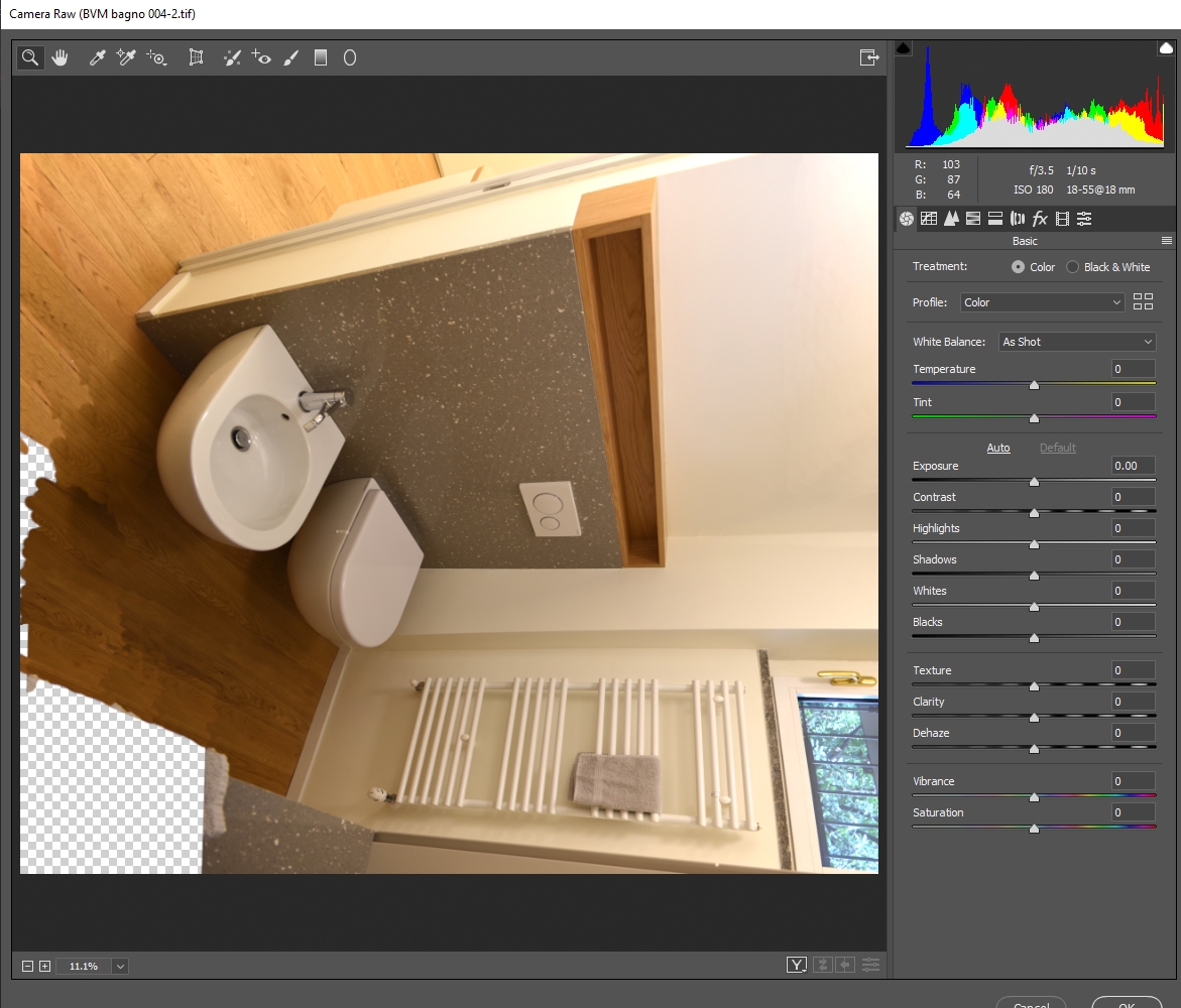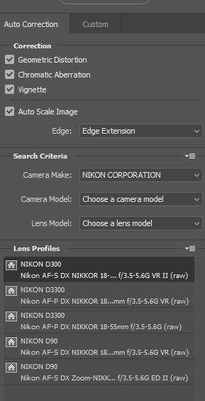 Lens correction (see below) is very useful to correct the geometric distortion and chromatic alteration (vignetting incluse). Very powerful, and you won’t imagine how the image will look after this, especially for interior photography, where often a 18mm focal length is used.